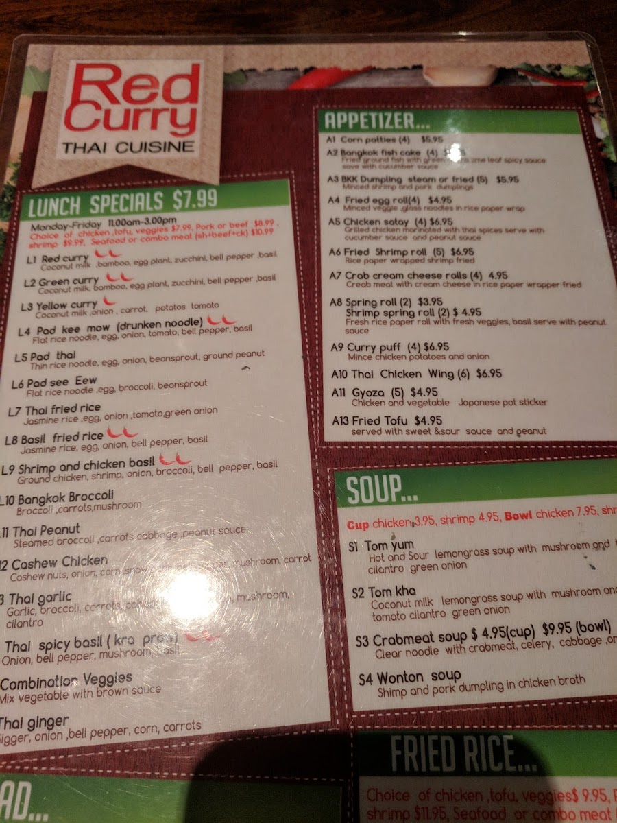 Spicy. Coconut milk, eggplant, bamboo shoots, zucchini, bell peppers, and fresh basil.